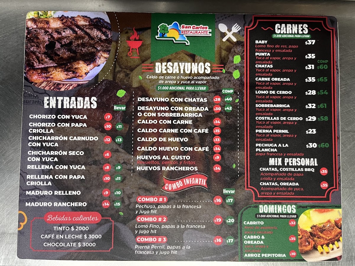 Welcome to Restaurante San Carlos, a culinary gem nestled in Piedecuesta, Santander, Colombia. Known for its vibrant flavors and attentive service, this restaurant is a must-visit for anyone seeking authentic local cuisine. The menu is particularly famous for its delectable caldos, rich stews that warm the soul, with options like caldo de carne and huevo available from 6 PM onward. Customers rave about the quality and heartiness of these dishes, making them perfect for a cozy dinner.
